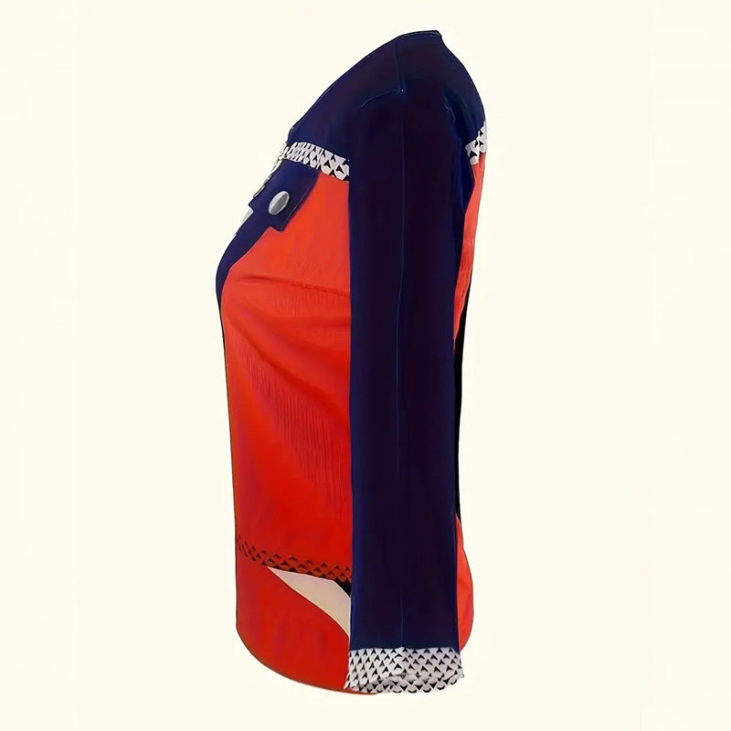 Elevate your seasonal wardrobe with this sleek color-block V-neck top , featuring a modern zip detail for contemporary flair. Designed with long sleeves and a tailored yet comfortable fit , this versatile blouse transitions effortlessly from casual daytime wear to semi-formal occasions .