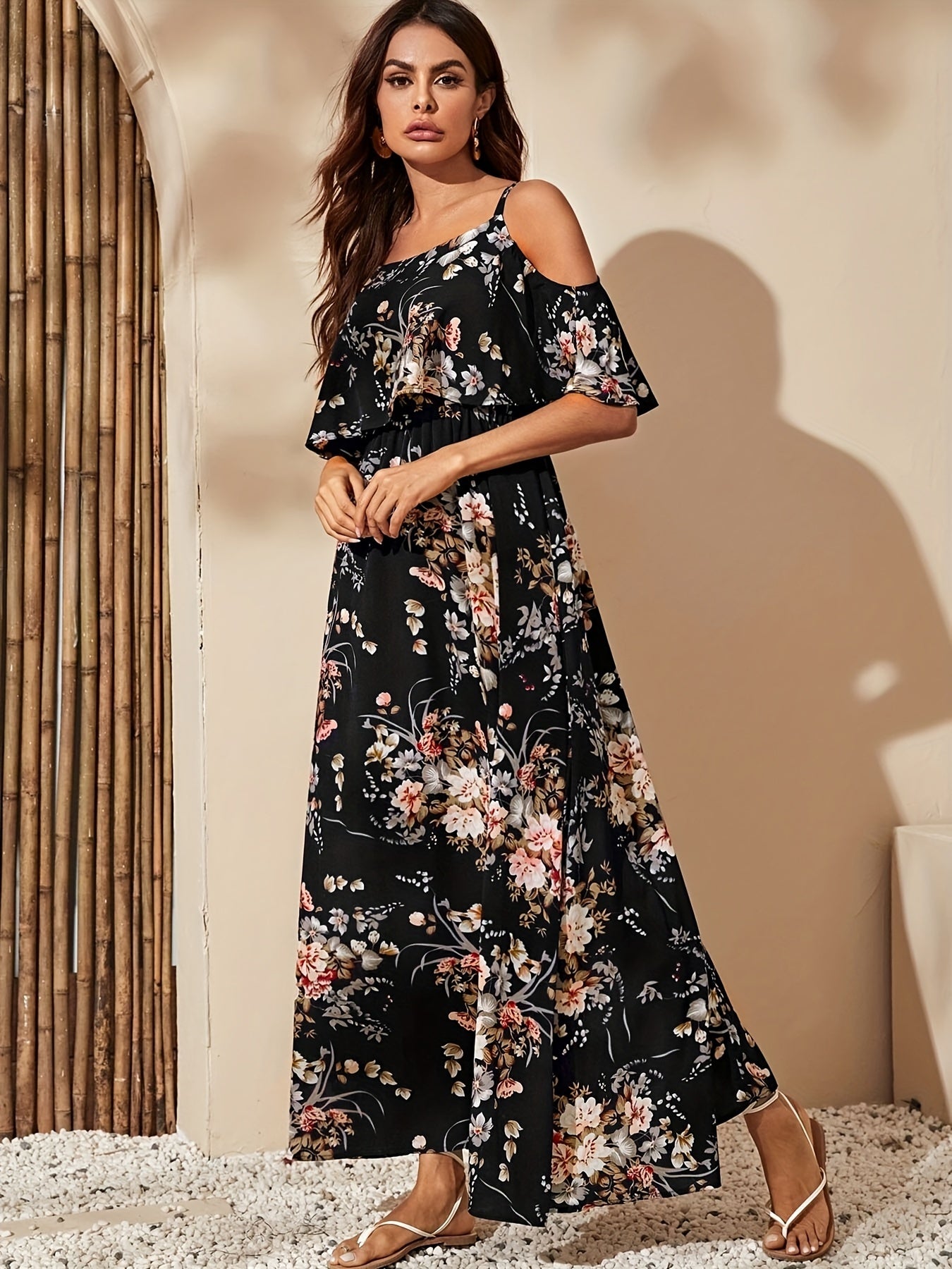Women's Elegant Strappy Floral Print Off-the-Shoulder Maxi Dress - Stylish Summer Party DressWomen's Elegant Strappy Floral Print Off-the-Shoulder Maxi Dress - Stylish Summer Party Dress