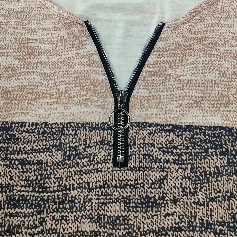 Women's Geometric Color Block V-Neck Zip Detail Long Sleeve T-Shirt - Spring&Fall Casual Slim Fit Top