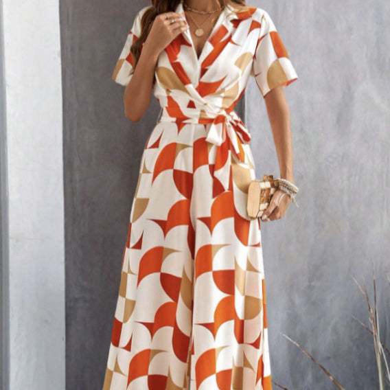Women's Geometric Pattern Printed Lace Up Shirt Jumpsuit