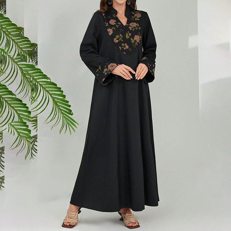 Women's Plus Size Elegant Summer Bohemian Floral Maxi Dress Middle Eastern Patchwork Black Long Dress