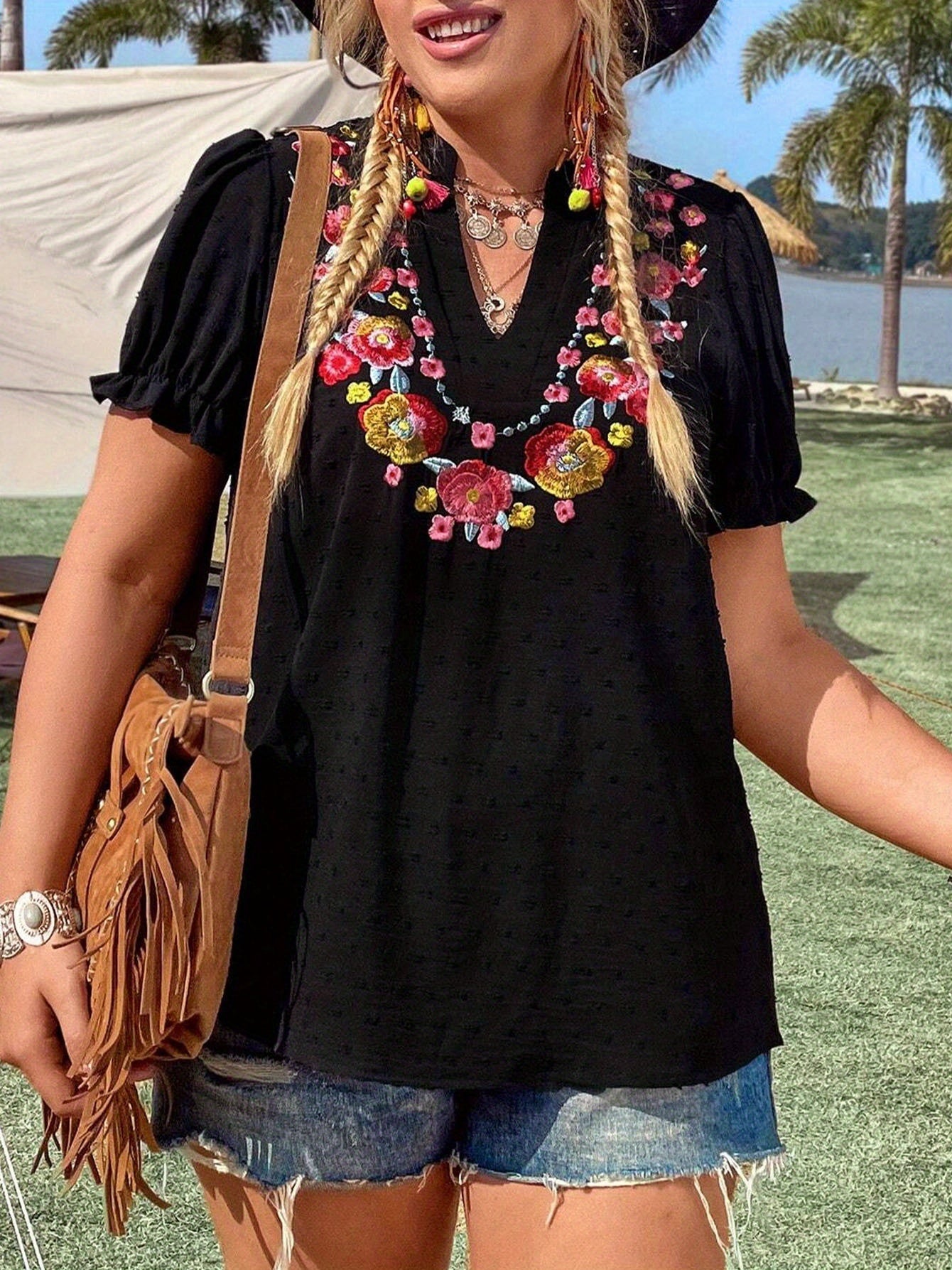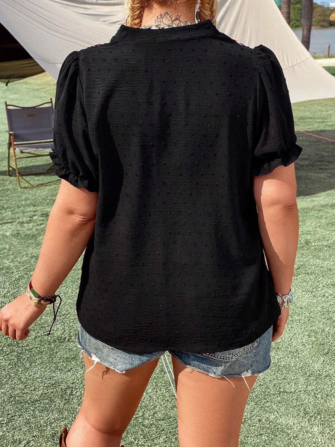 Women's Plus Size Floral Embroidery Summer Casual Short Sleeve V-Neck Swiss Dot Blouse Top