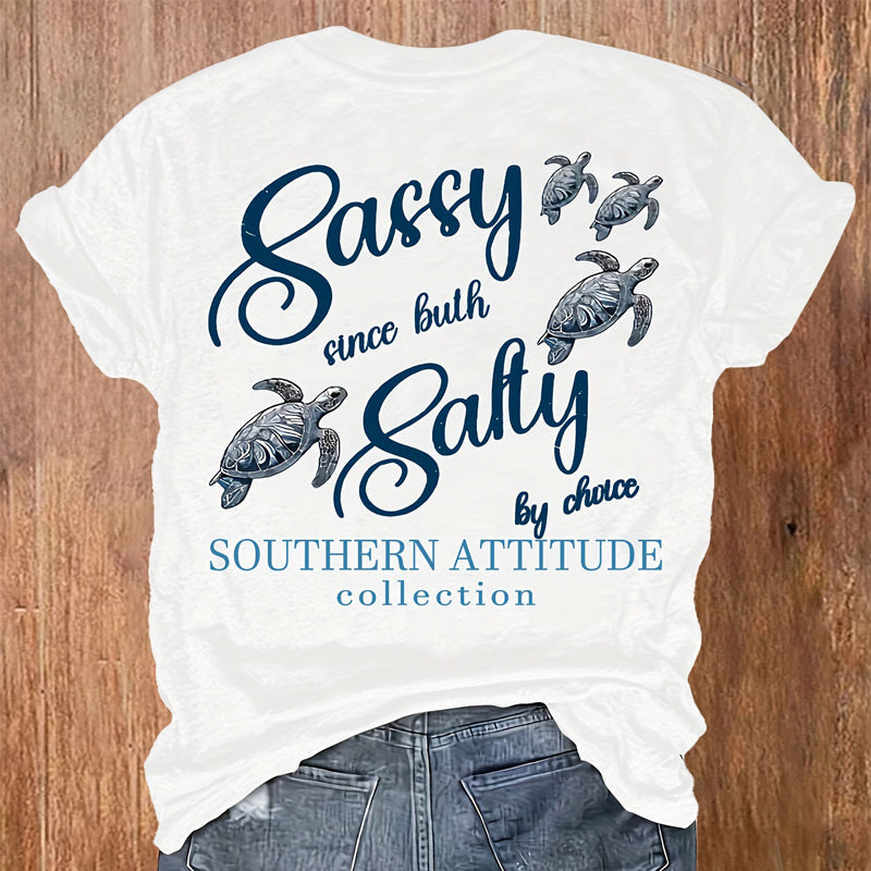 Women's Round Neck Turtle & Slogan Graphic Tee - Playful Summer Essential