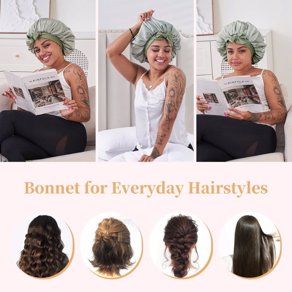Hair Care Accessories: Silk Satin Bonnet Tailored for All Hair Types (1A-4C). No Matter if You Have Straight / Wavy / Curly / Coily / Kinky Hair, No Worries for Hair Care During Sleep & Reducing Hair Friction in Sleeping Adjustable Fit & Non Slipping Off: 26-Inch Tie Band & a Widened, High-Elasticity Brim Fit Head Circumferences of 19-36 Inches, Ensuring the Bonnet Stays in Place During Sleep & Daily Activities Without Leaving Forehead Marks Shine Your Hair: Crafted from Luxurious Charmeuse Satin, it Cradles Your Hair With Love, Locking in Moisture, Banishing Frizz & Ensuring Your Styles Last Longer Double Layer Versatile Hair Bonnet: Bonnet Reduces Hair Shedding & Visibility Obstruction During Household Activities & Workouts. Our Bonnet Features a Reversible Design, Offering Dual-Sided Usability Usage Scenarios: Silk Hair Wrap Bonnet is Perfect For Any Hair Care And Styling Scenario. Use It With Hair Oils For Treatment, With Curlers For Styling, or While Sleeping to Reduce Friction And Hair Damage, As Well As to Keep Oils From Staining Your Bedding. It Also Pairs Well With Scrunchies For Hair Management And Minimizes Hair Interference During Facial Care. Whether At Home or At Work, The Bonnet Helps Prevent Hair From Slipping Out of Place