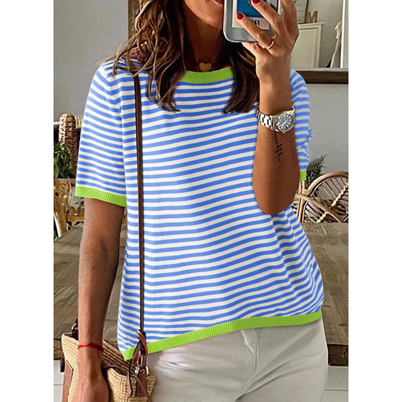 Women's Striped Color Block Sweater – Short Sleeve Crewneck Pullover