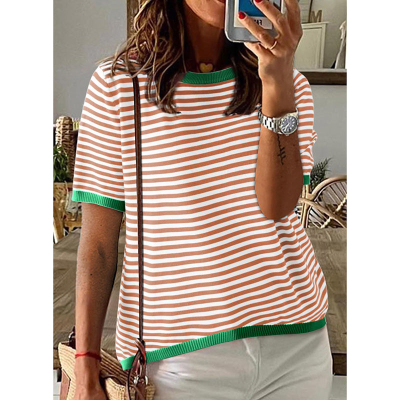 Womens Tops Casual Summer Crewneck Short Sleeve Striped Color Block Trendy Pullover Sweaters