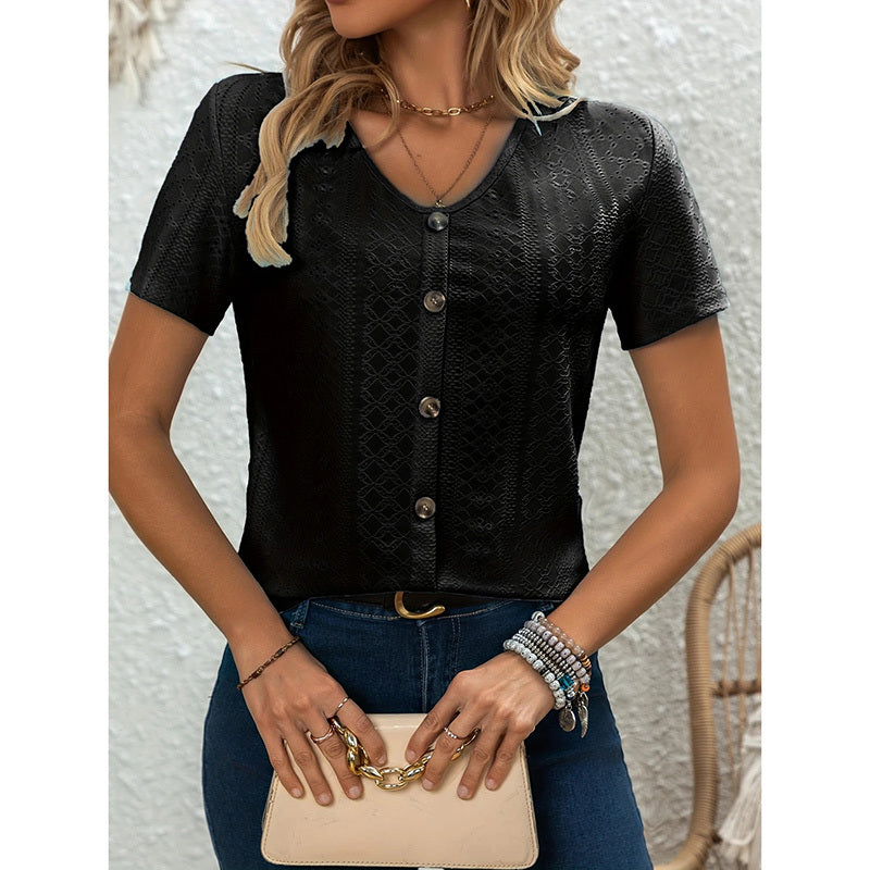 Women's V-Neck Eyelet Top – Short Sleeve Casual Button Shirt for Summer