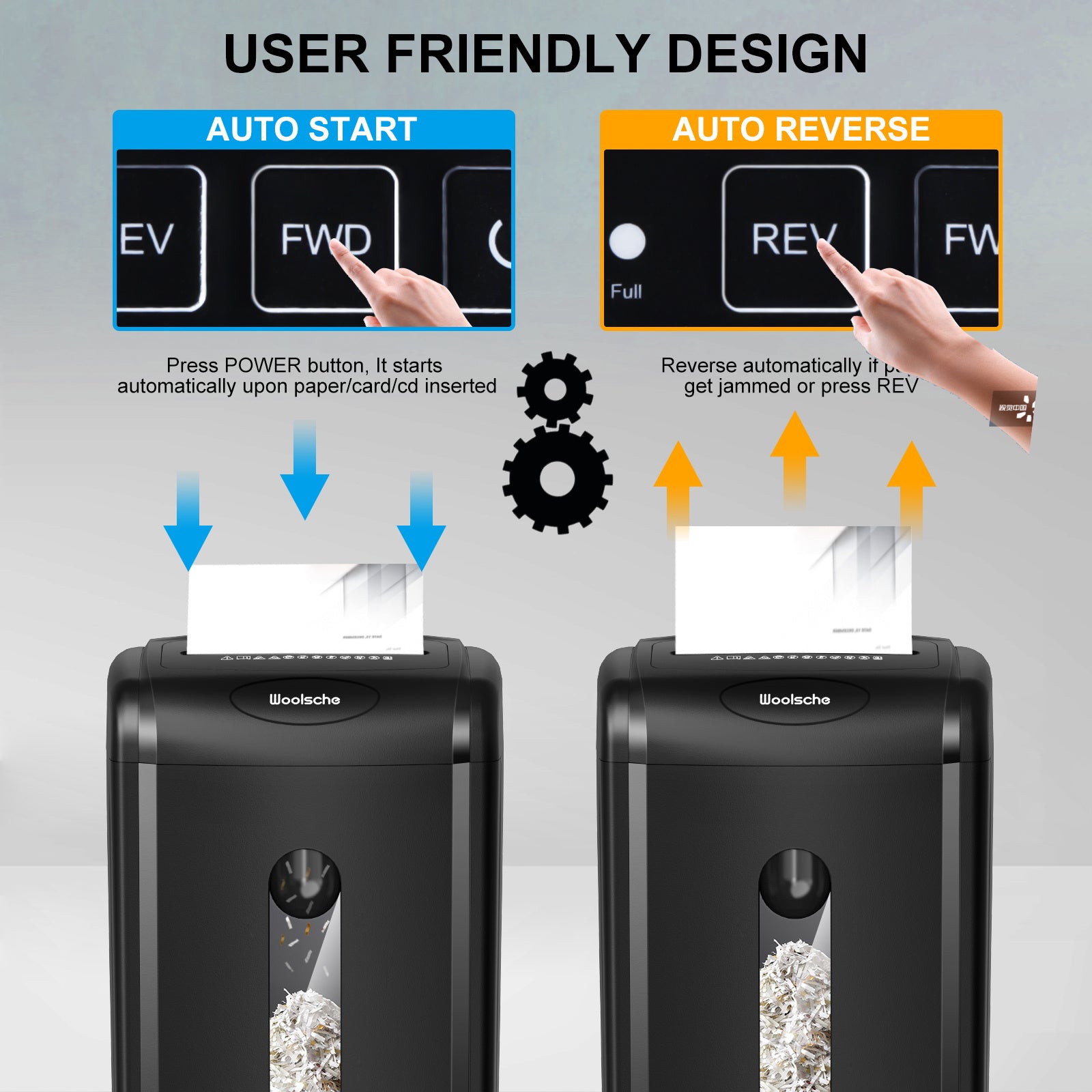 【Convinient Design &15 Minutes Shredding】With 15 minutes Non-Stop Shedding,overload operation of the Home shredder machine will Auto start overheating protection with 45 munites cooling time. It include 3-mode control switches (FWD,Power and Auto reverse functions simplify shredding and paper jammed clearing processes